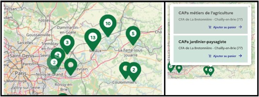 Chaque « ballon » de la carte correspond à un établissement et donne accès à toutes les formations sélectionnées par la recherche et qui sont préparées dans cet établissement.